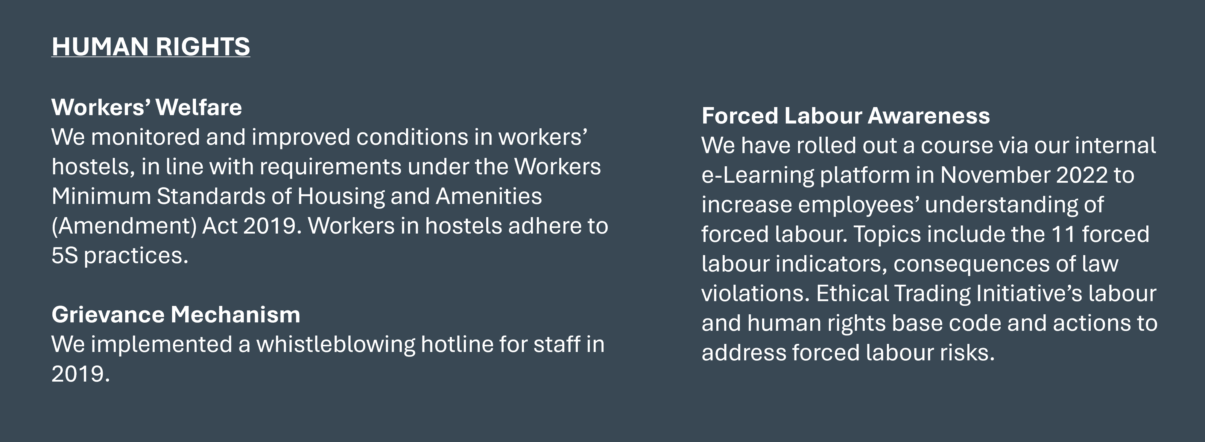 As part of our ESG initiatives, Guocera and HLYM partnered with Kembara Kitchen, a charitable partner, to support those affected by the recent floods. On 5 December 2024, we sponsored essential items, including a RM500 donation from Guocera in necessities, an initiated employee volunteering from various departments to work alongside Kembara Kitchen's crew in preparing #SantapanHeroMeals. We have helped pack 1,000 ready-to-eat meals, which were sent to Yayasan Sultanah Bahiyah for the flood victims in Kedah.